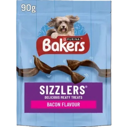 BAKERS® Sizzlers® are delicious chewy rashers with an irresistible bacon flavour, that not only taste great, but also contain specific nutrients to help keep your dog healthy too! Each chew contains omega 3 & 6 to help maintain healthy skin & a glossy coat, Vitamins & antioxidants to help support natural defences and is supplemented with B Vitamin s to help maintain your dog's energy levels. With a low in fat recipe, they also help maintain a healthy waistline.* *Remember to adjust the main meal accordingly Cereals, Glycerol, Meat and Animal derivatives (11 %)*, Vegetable protein extracts, Various sugars, Oils and fats, Minerals, Milk and milk derivatives. *equivalent to 23% rehydrated meat and animal derivatives. Protein 15.2% Fat content 5.9% Crude ash 3.9% Crude fibres 0.9% Moisture 24.0% Omega 3 fatty acids : 0.09% Omega 6 fatty acids: 1.6% Daily feeding amount up to: 7 kg: 1 pieces 15 kg: 2 pieces 30 kg: 3 pieces For your dog’s health, respect the feeding guide and exercise him daily. Clean, fresh drinking water should always be available. Supervise your dog when giving him/her the treat.